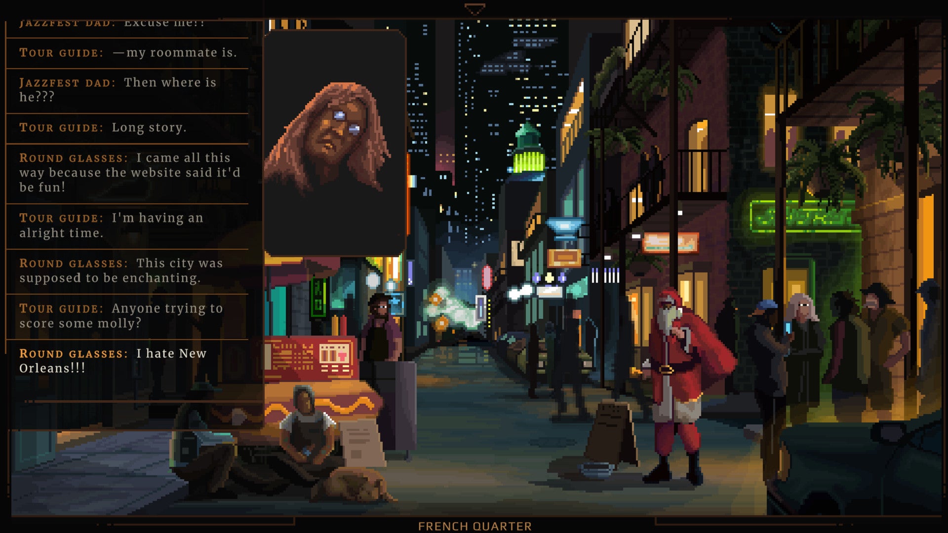 A chaotic bayou pirate, bar-stool private detective, escaped security android, and your stuffed childhood monkey will all offer assistance in an eroding and uncertain world. Solve puzzles, fight your way past corporate security goons, and infiltrate an influencer cult squatting an abandoned mall on the outskirts of New Orleans.