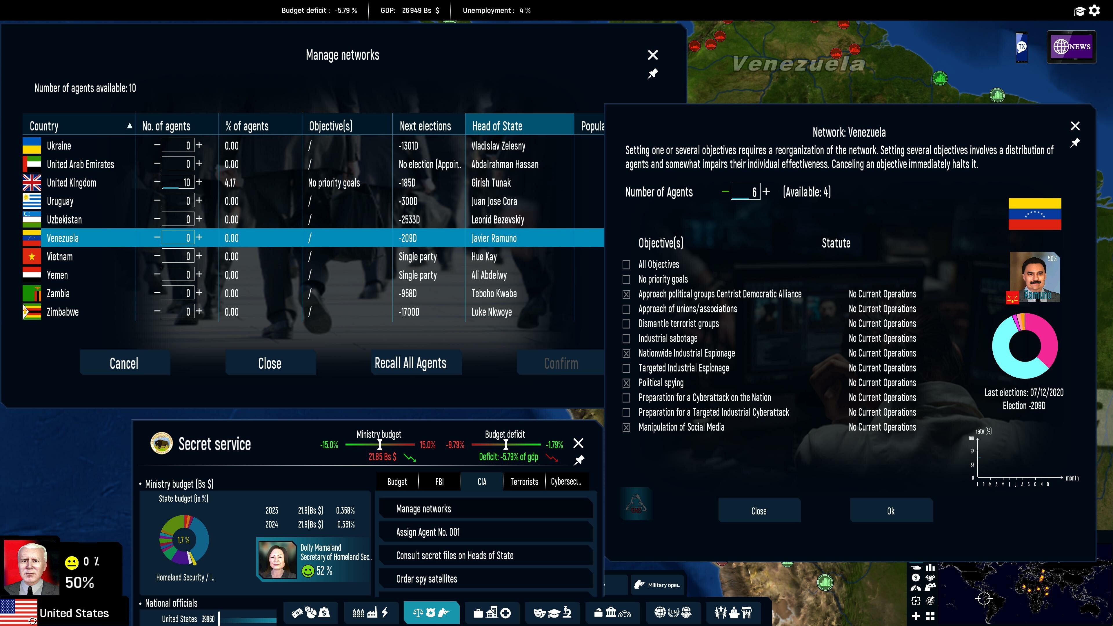 Secret services play an important role. They have an arsenal of espionage and special operations: reveal scandals about an opposing political party, dismantle terrorist networks, sabotage foreign infrastructure, assassinate an opponent, send reconnaissance drones or position satellites to locate enemy units, etc.