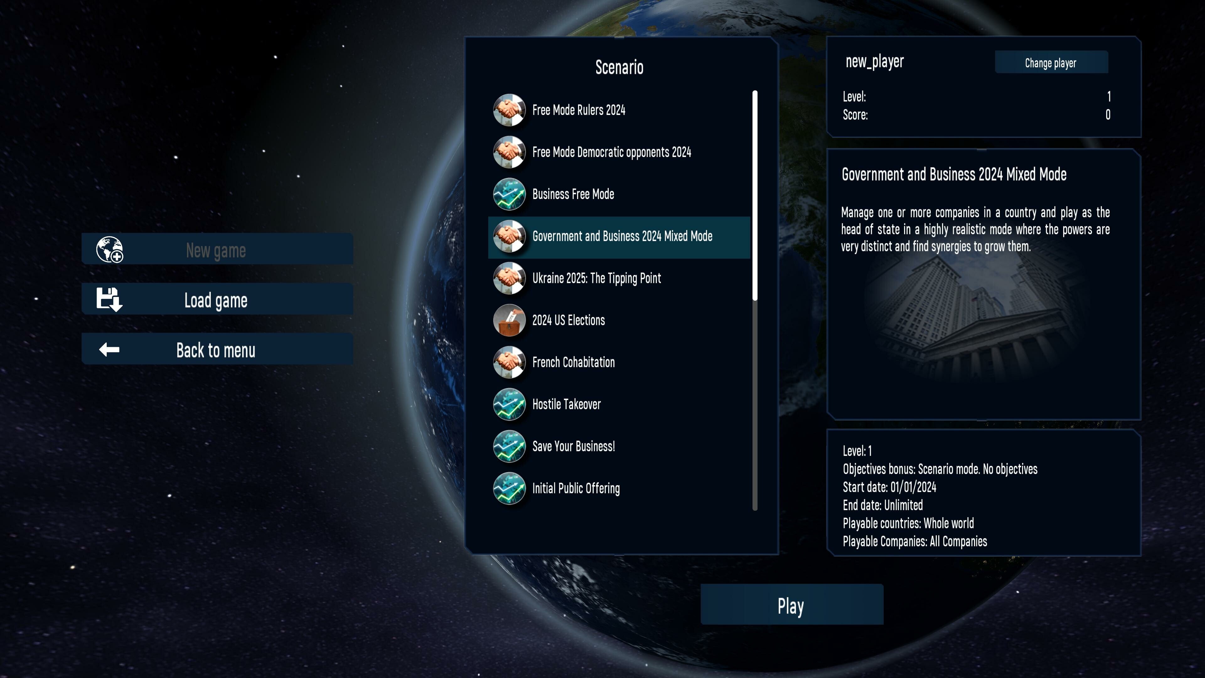 You can opt to control one or more countries or one or more major corporations simultaneously and devise collaborative strategies to change your own destiny or the world's. Game sessions are customizable in several ways: activity level of terrorist organizations, probability of natural disasters, reactions of the people, outbreak of wars... More than twenty contextual scenarios with current events from today's world are integrated.