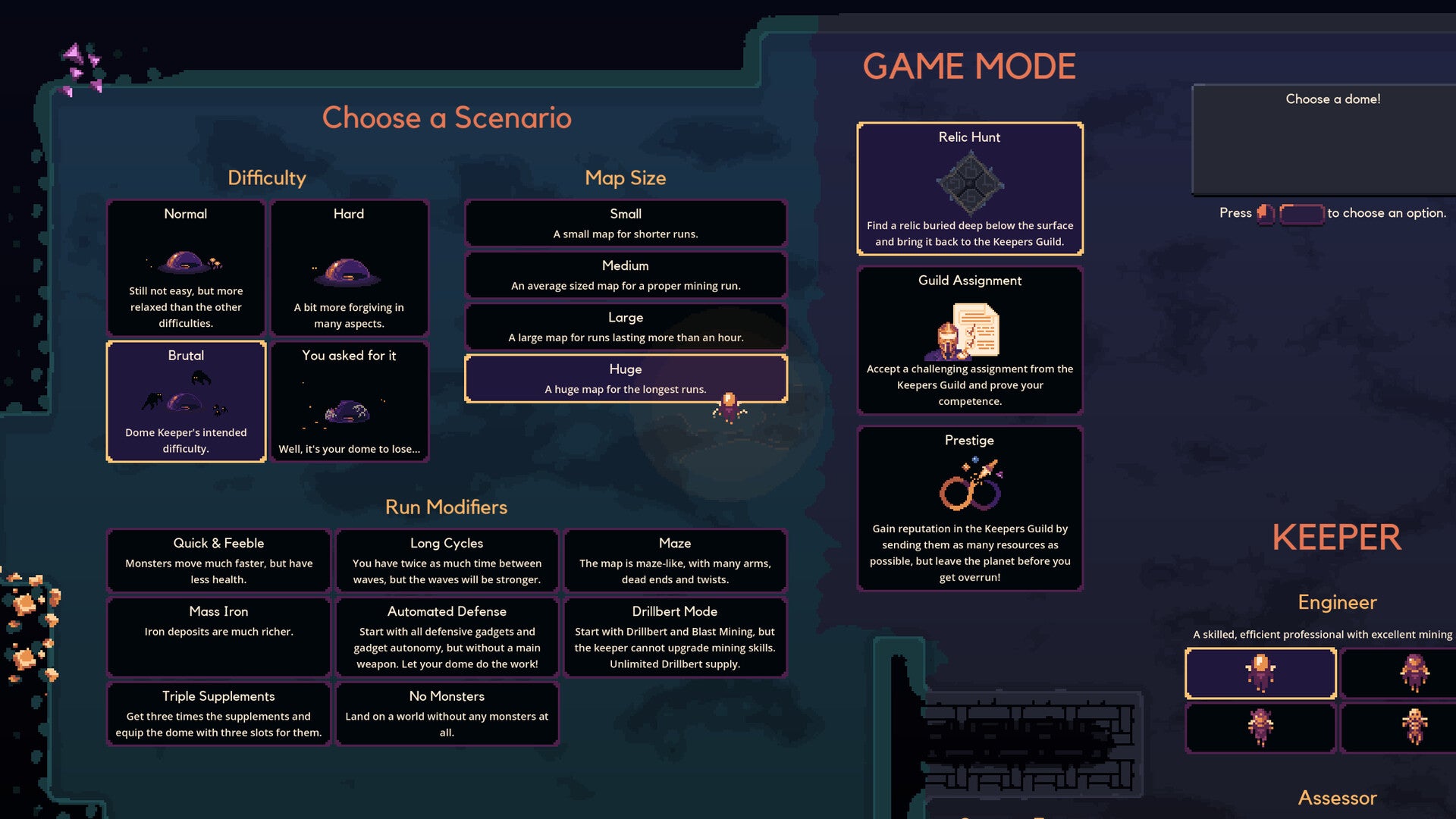 Customise your setup and find a playstyle that works for you by choosing from two unique keeper types, four different domes, and four primary gadgets. Pick a run modifier, adjust difficulty settings and discover dozens of secondary gadgets while you dig through the earth.