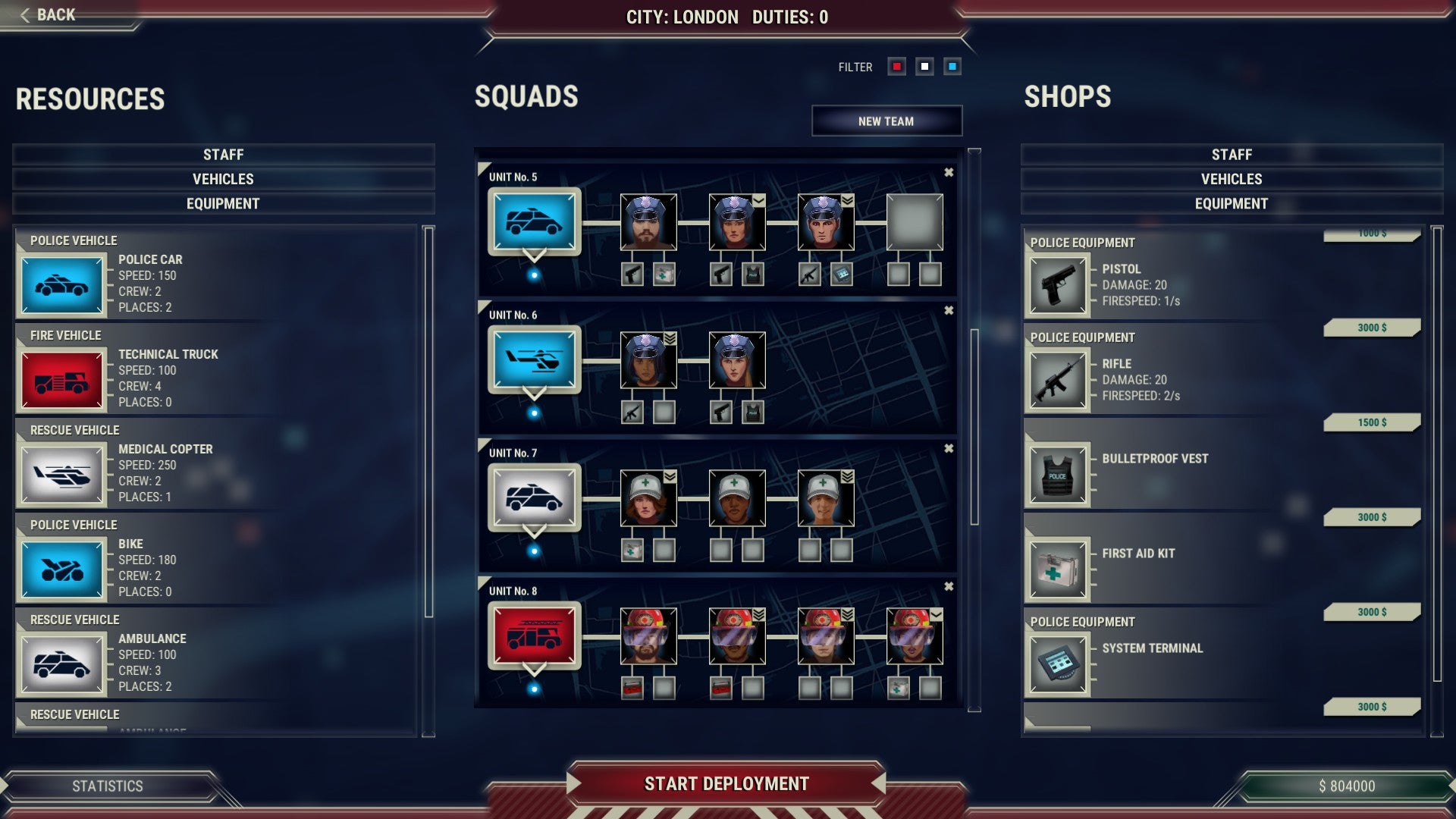 A number of police, fire department and paramedic units are at your disposal. The forces may use a variety of vehicles (from common ambulances to police helicopters), essential equipment (e.g., bulletproof vests, first aid kits and technical tools) and consist of team members with different abilities.