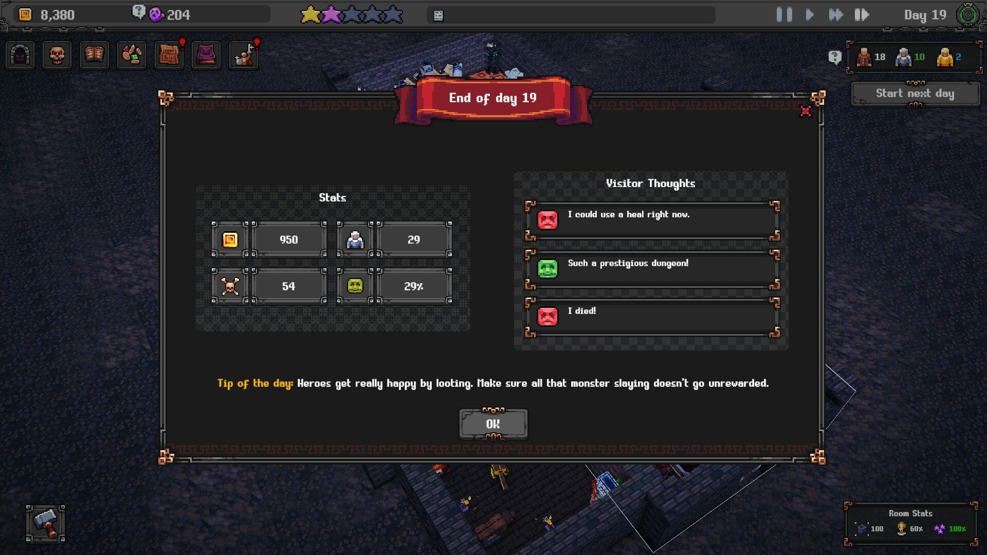 Lure adventurers into your evil dungeon by summoning mighty foes, building huge and curious rooms, and a maze of deceptive opportunities. Watch how they perform and optimize every inch of your genius design. Ensure they don't go back empty-handed, so they keep coming back.