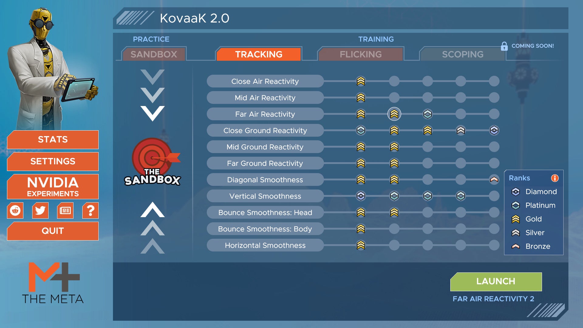 Great tracking is all about smoothness and this trainer will help you get results faster. There are eleven core skills to perfect, each featuring five difficulty levels—you’ll always have something to focus on. Bots are wired with dynamic difficulty and get harder as you perform better. A new ranking system shows your progress toward each level. New charts show your progress and how smooth you really are.