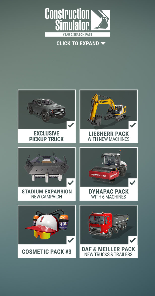 It's about time for the second year: Expand your gaming experience once more with additional content in the Construction Simulator with the Year 2 Season Pass! Enjoy brand new machines from three well-known manufacturers, another civilian four-seated car, and a new and exciting contract campaign for hours of fun – all in one package.