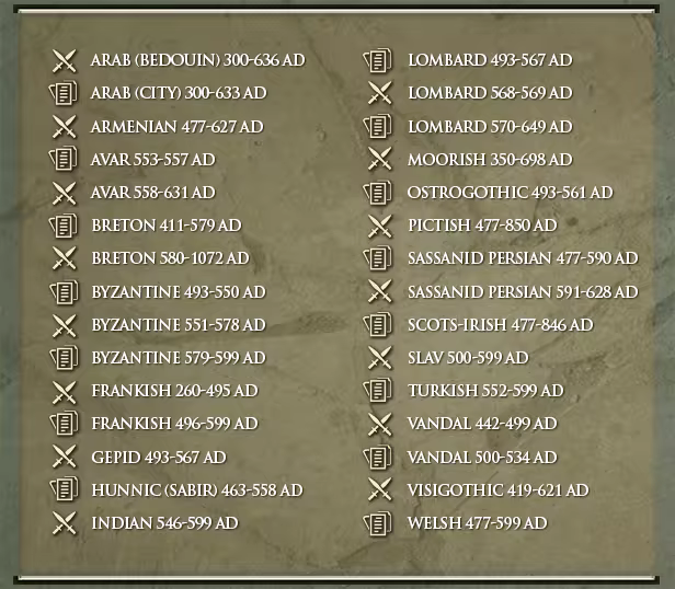 - 11 new named factions: Avars, Byzantines, Franks, Gepids, Lombards, Ostrogoths, Slavs, Turks, Vandals, Visigoths, Welsh.