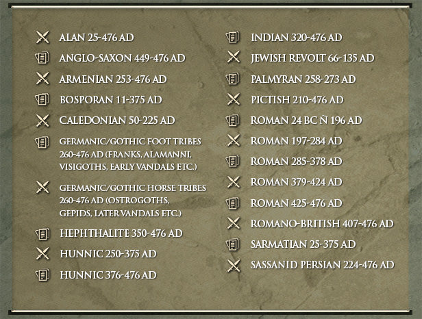 • 17 new units: Early Imperial Legionaries, Early Imperial Auxiliaries, Auxiliary Archers, Veteran auxiliary cavalry, Roman Lancers, Late Roman Lancers, Legio Palatina, Legio Comitatensis, Auxilia Palatina, Limitanii, Armoured Horse Archers, Expert Armoured Horse Archers, Fierce Nomad Horse Archers (Huns), Fierce Nomad Light Horse Archers (Huns), Irregular Foot (trousered), Pictish Spearmen and Jewish Zealots. Also the following that were available in the base game, but not used: Roman auxiliary cavalry, Sassanid levy spearmen.